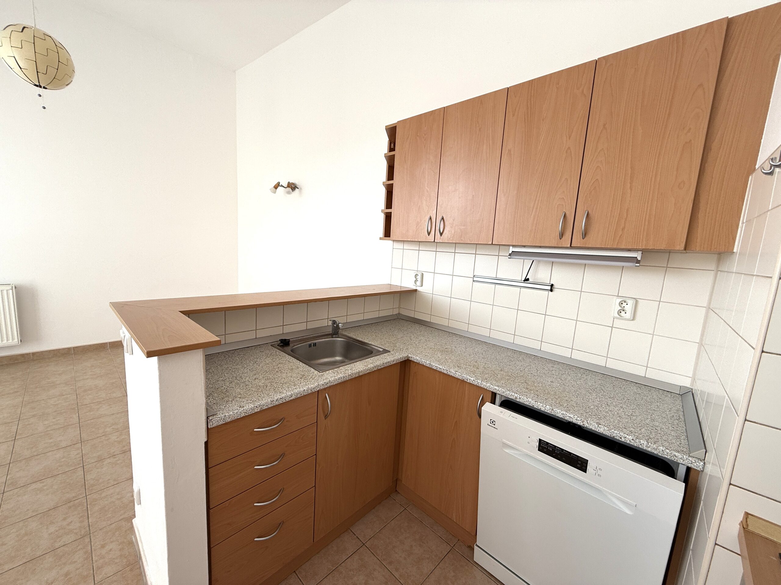 Dominantu bytu tvoří prostorný obývací pokoj s kuchyňským koutem, linkou, jenž je vybavena spotřebiči Elektrolux.