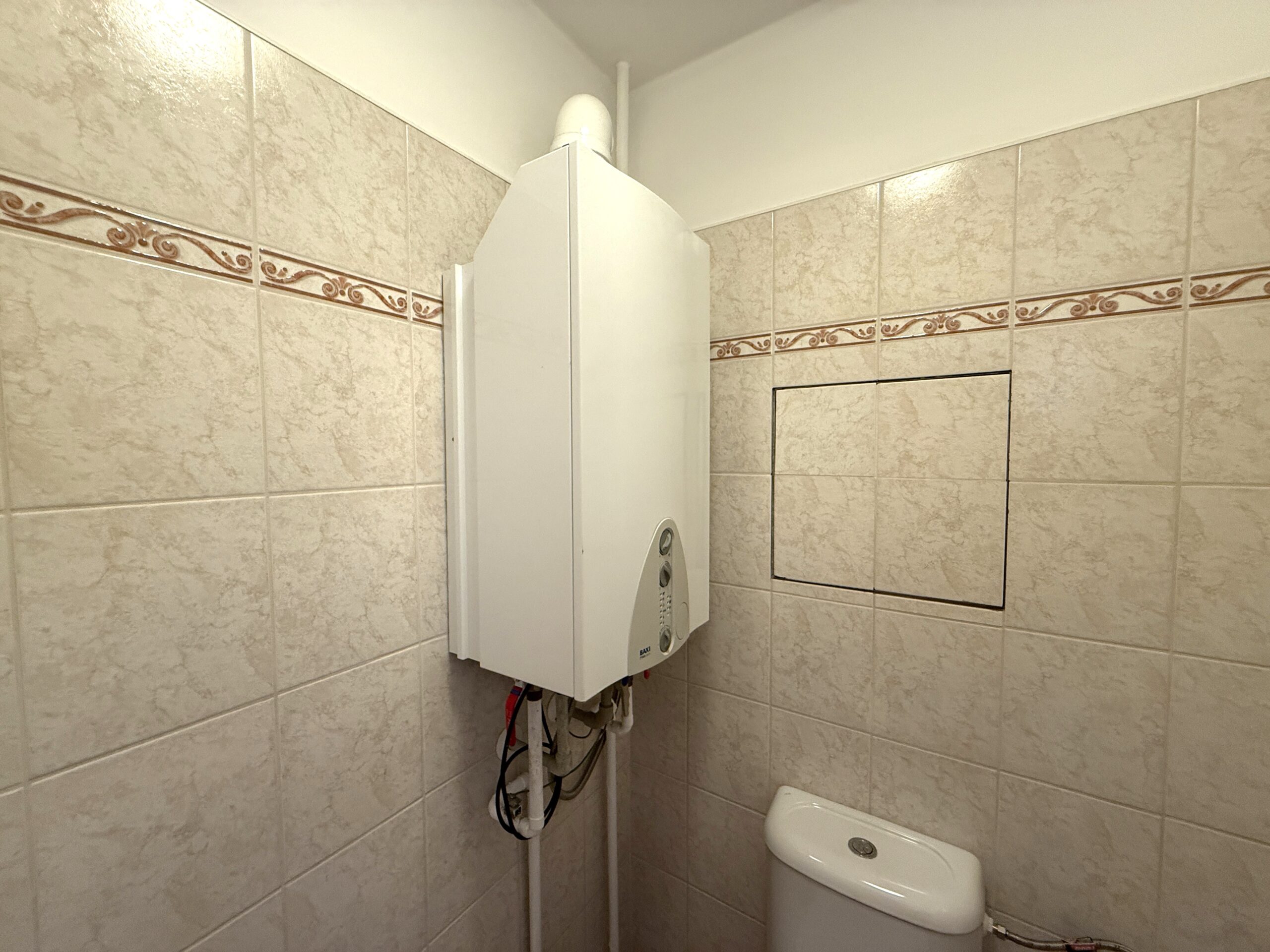 Toaleta je samostatně a v místnosti je umístěn plynový kotel BAXI, jenž zajišťuje vytápění a ohřev vody.